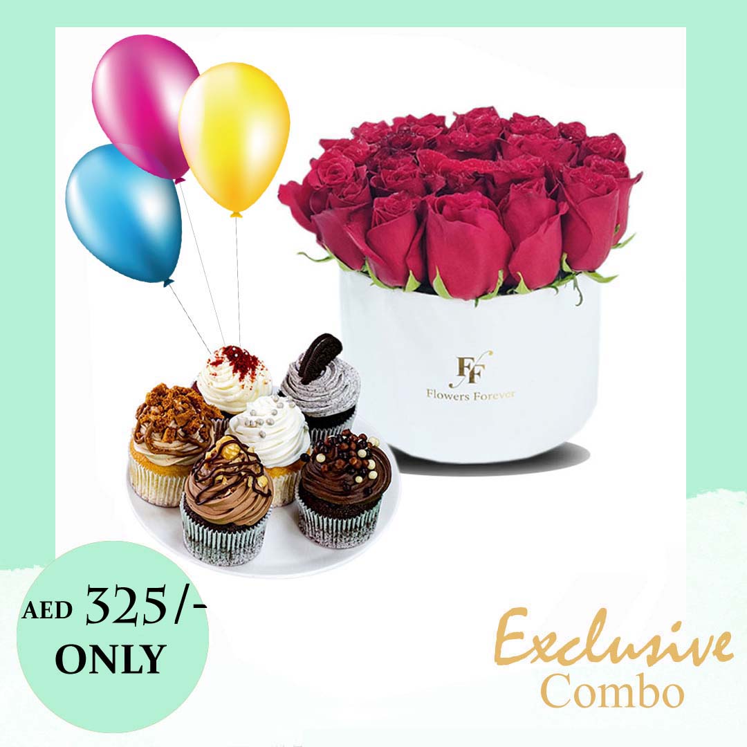 Big white box arrangement of luxury roses, 5 mix cup cakes and balloon.