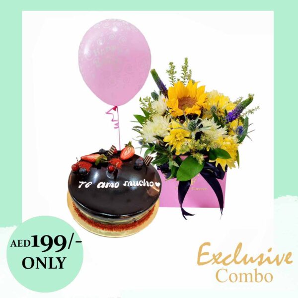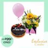 Small square box of mix flower arrangement, 500g chocho truffle cake & balloon.