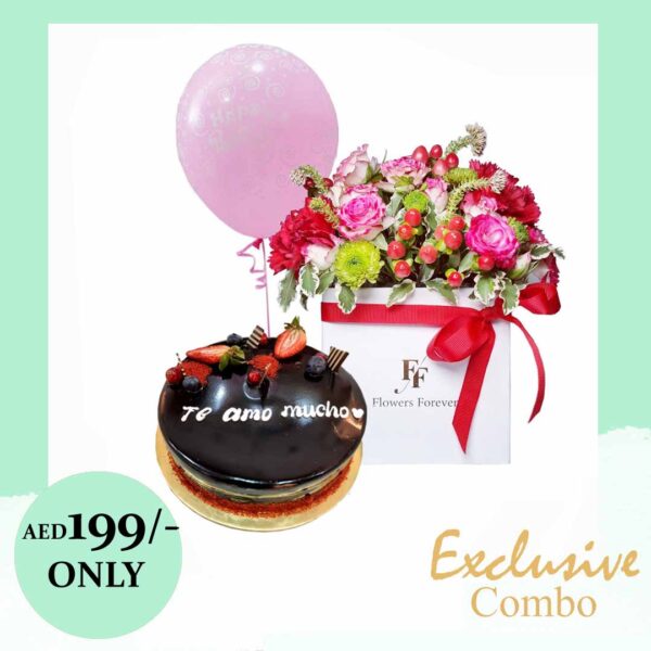 small square box of mix flower arrangement, 500g chocho truffle cake & balloon.